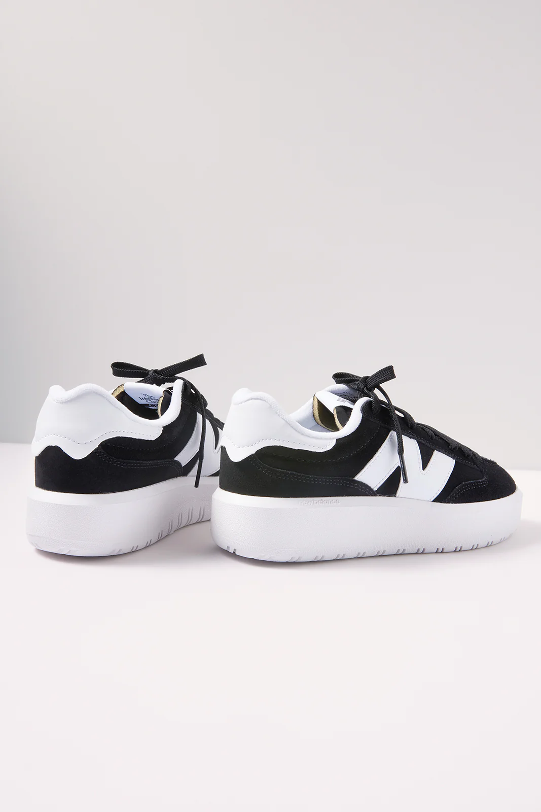 A bold platform sole updates these retro-inspired sneakers by New Balance, featuring a low-top, paneled design in black suede fabric.