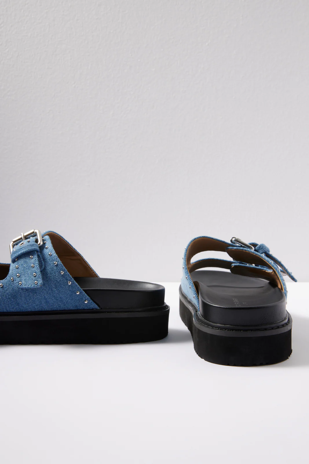 Denim fabric elevates these stylish platform sandals by Marc Fisher LTD, featuring adjustable straps and silver stud details. Slip them on with your favorite warm-weather look.
