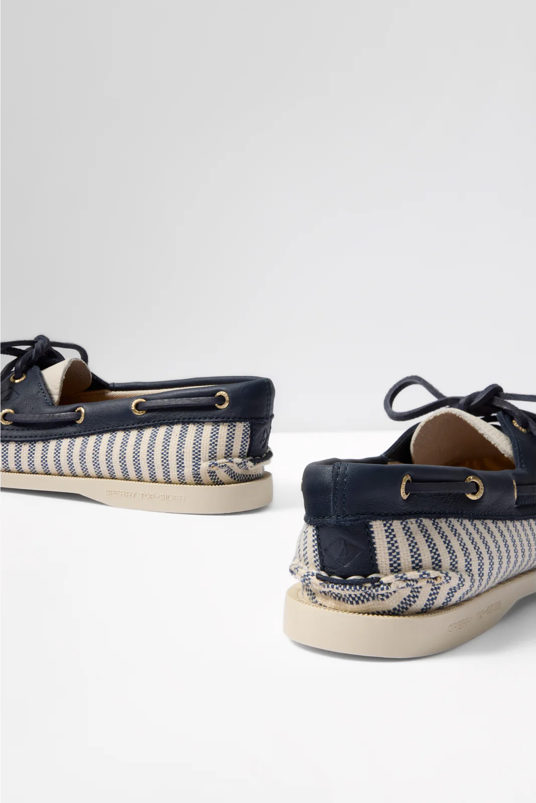 Give your look a hint of coastal style with these classic boat shoes by Sperry. Designed with a striped fabric and leather upper, the Authentic Original 2-Eye Boat Shoe features a high-traction rubber outsole, rawhide laces, and traditional moccasin stitching.