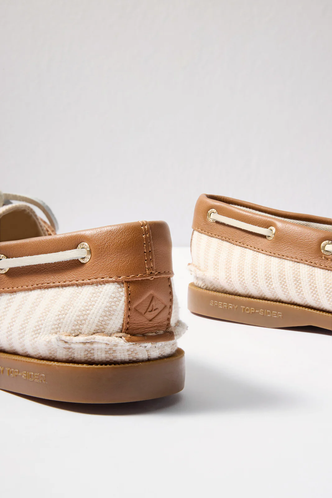 Give your look a hint of coastal style with these classic boat shoes by Sperry. Designed with a striped fabric and leather upper, the Authentic Original 2-Eye Boat Shoe features a high-traction rubber outsole, rawhide laces, and traditional moccasin stitching.