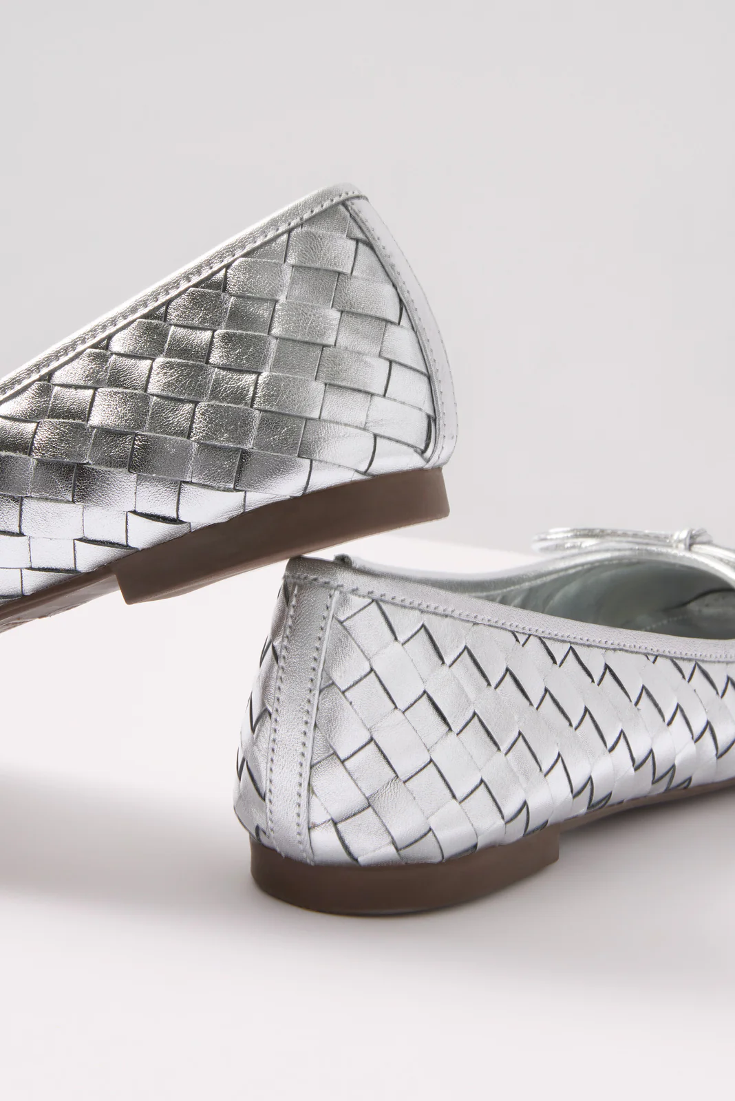Chic and eye-catching, theseĀ silver ballet flats by Schutz are crafted in woven metallic leather with a squared toe and bow detail.