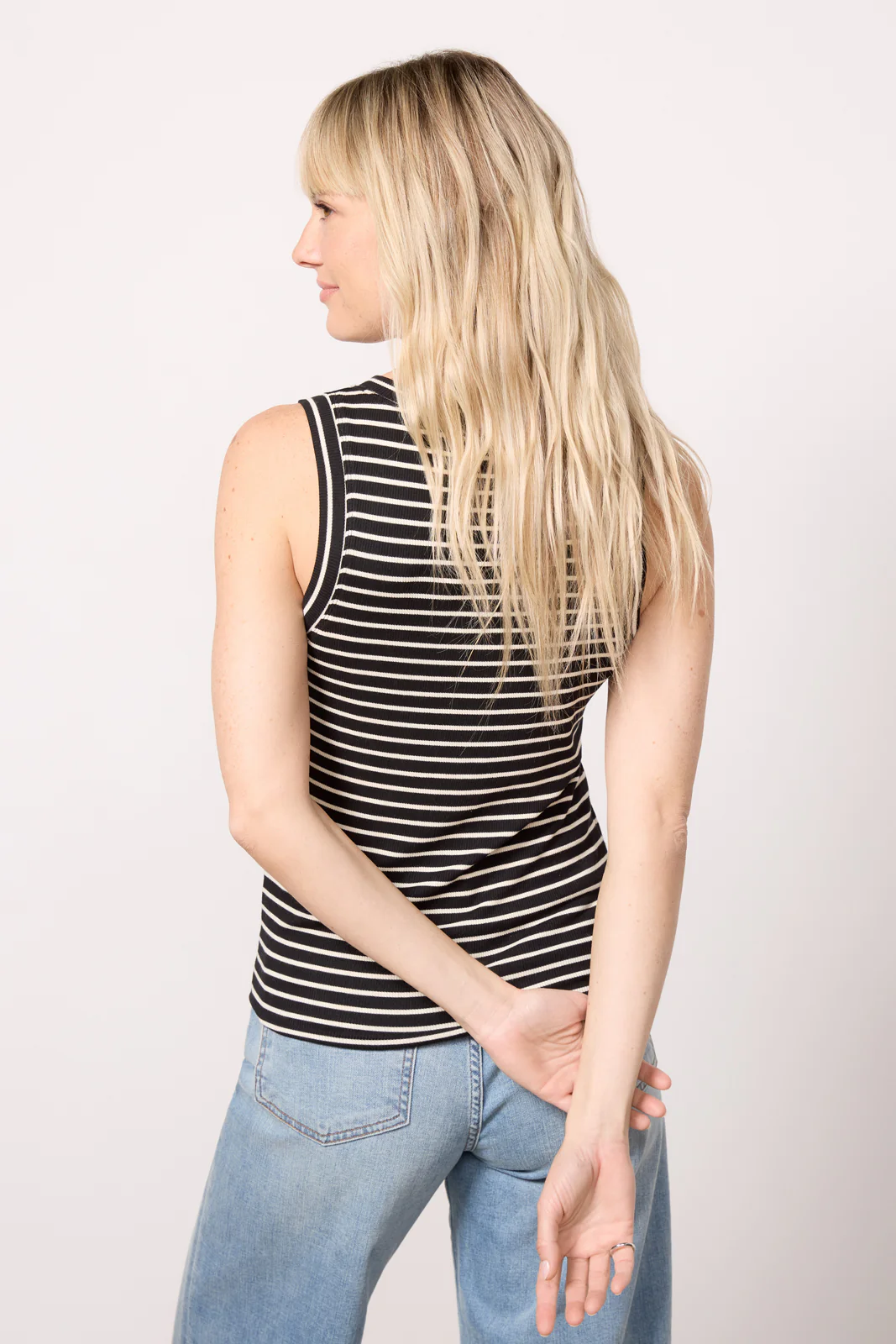 A versatile wardrobe staple, this LNA tank features a fitted crewneck silhouette in double-layered, soft rib knit fabric. Wear it alone or under a button-down, cardigan, or denim jacket.Â