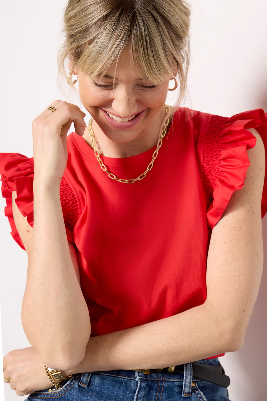 Ruffled flutter sleeves add a fun and feminine edge to the Maia top by EVEREVE, featuring a crewneck silhouette in soft cotton fabric.