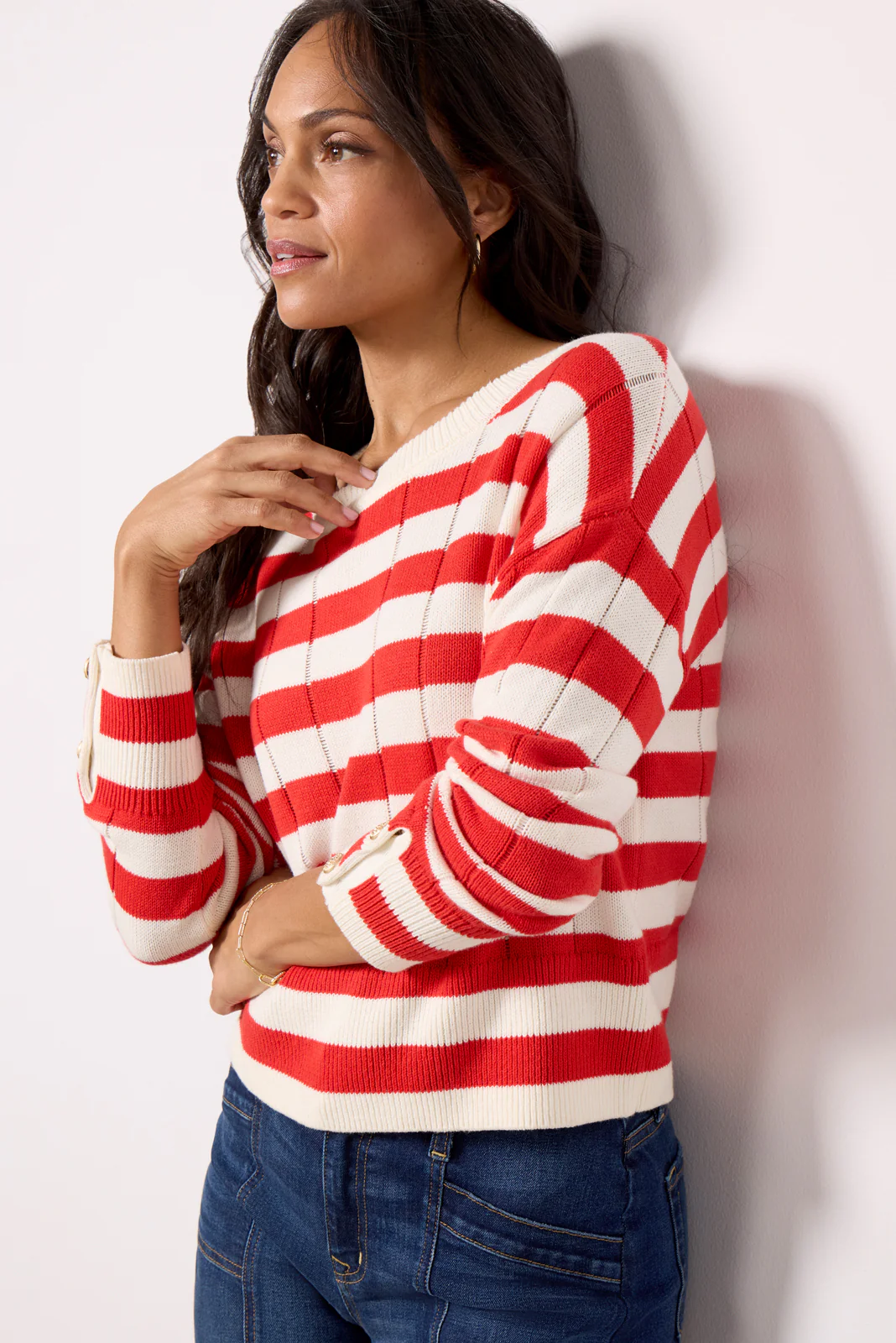 Red-and-white stripes elevate this chic crewneck sweater by EVEREVE. The Shayla pullover is crafted in a cotton-blend knit and features a ribbed hem, vertical stitching details, and ribbed cuffs with gold buttons.