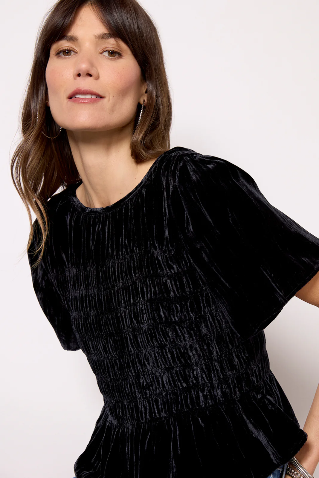 Perfect for your holiday season wardrobe, the Rosie top by Rails is crafted in soft velvet fabric and features a shirred bodice, ruffled peplum hem, and short sleeves.